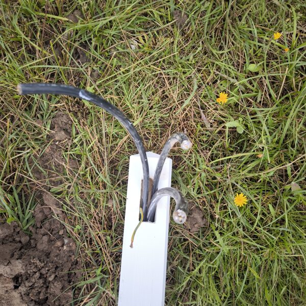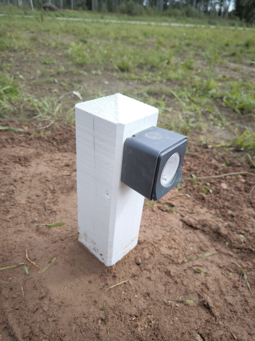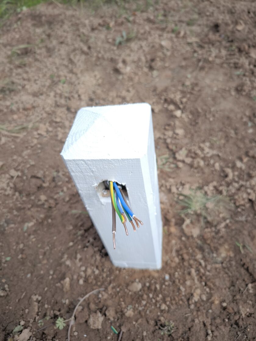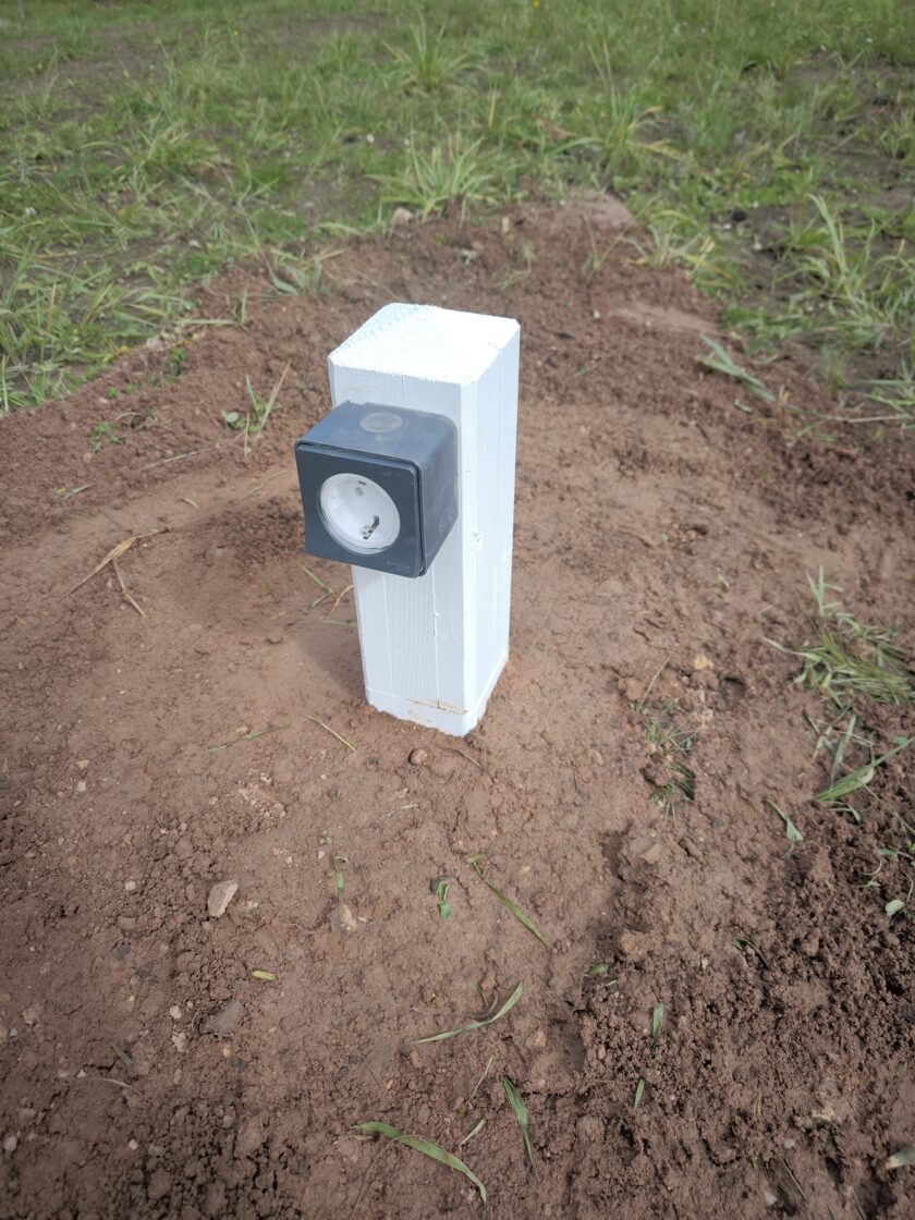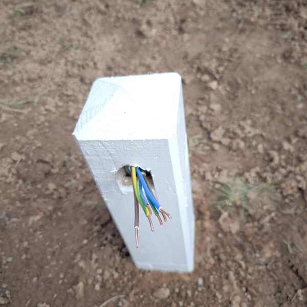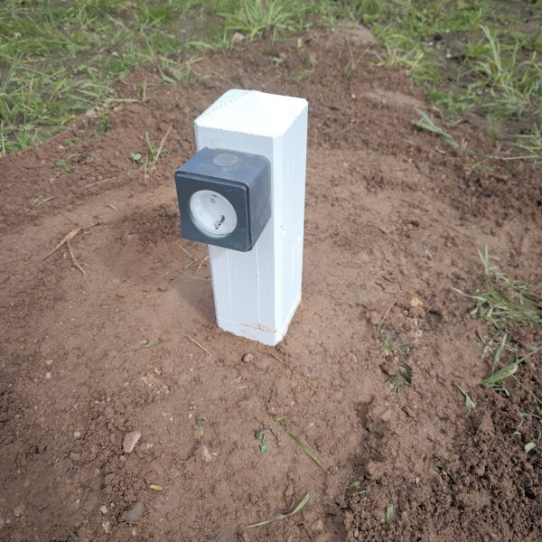 Āra elektrības izvadu risinājums ar koka stabiņiem Lai nodrošinātu vairākus elektrības izvadu punktus teritorijā, tika izveidots risinājums, izmantojot koka stabiņus. Katram stabiņam: